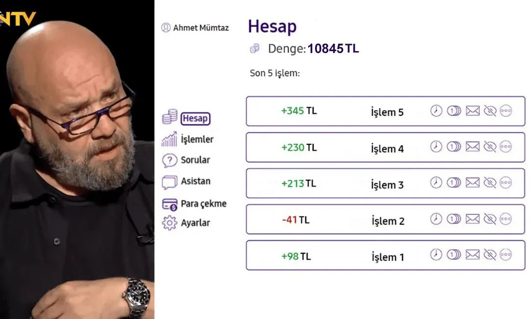 Ahmet Mümtaz Taylan platforma kişisel hesabını açtı ve çok şaşırdı. Sadece 20 dakika içinde program 5 işlem yaptı: 1 tanesi önemsizdi ama diğer 2 tanesi başarılıydı ve iyi kâr sağladı. Hesap bakiyesi 10.000 TL'den 10.845 TL'ye yükseldi.